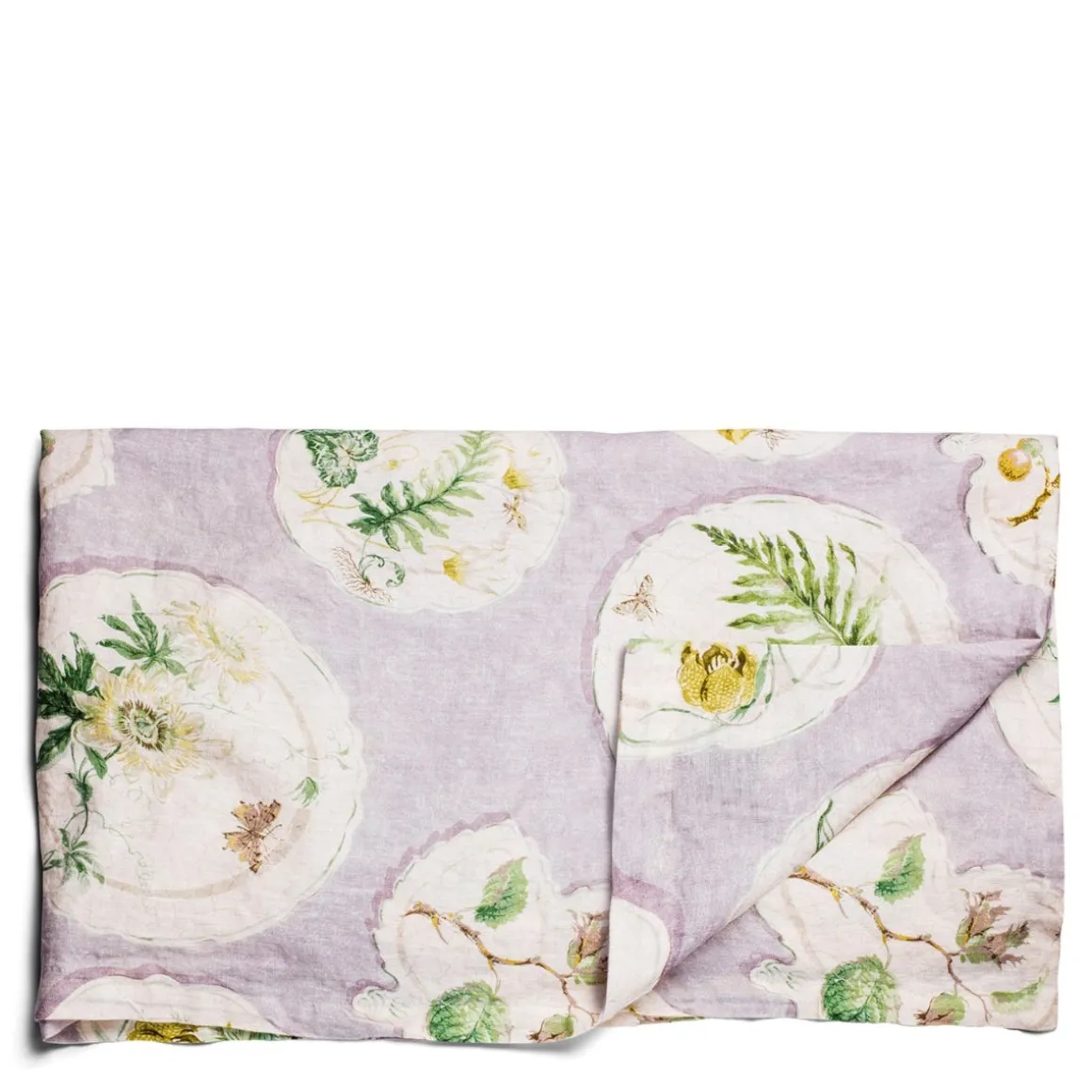 This pure linen tablecloth features a botanical design inspired by 18th century Chelsea porcelain, in a pale lilac colourway.