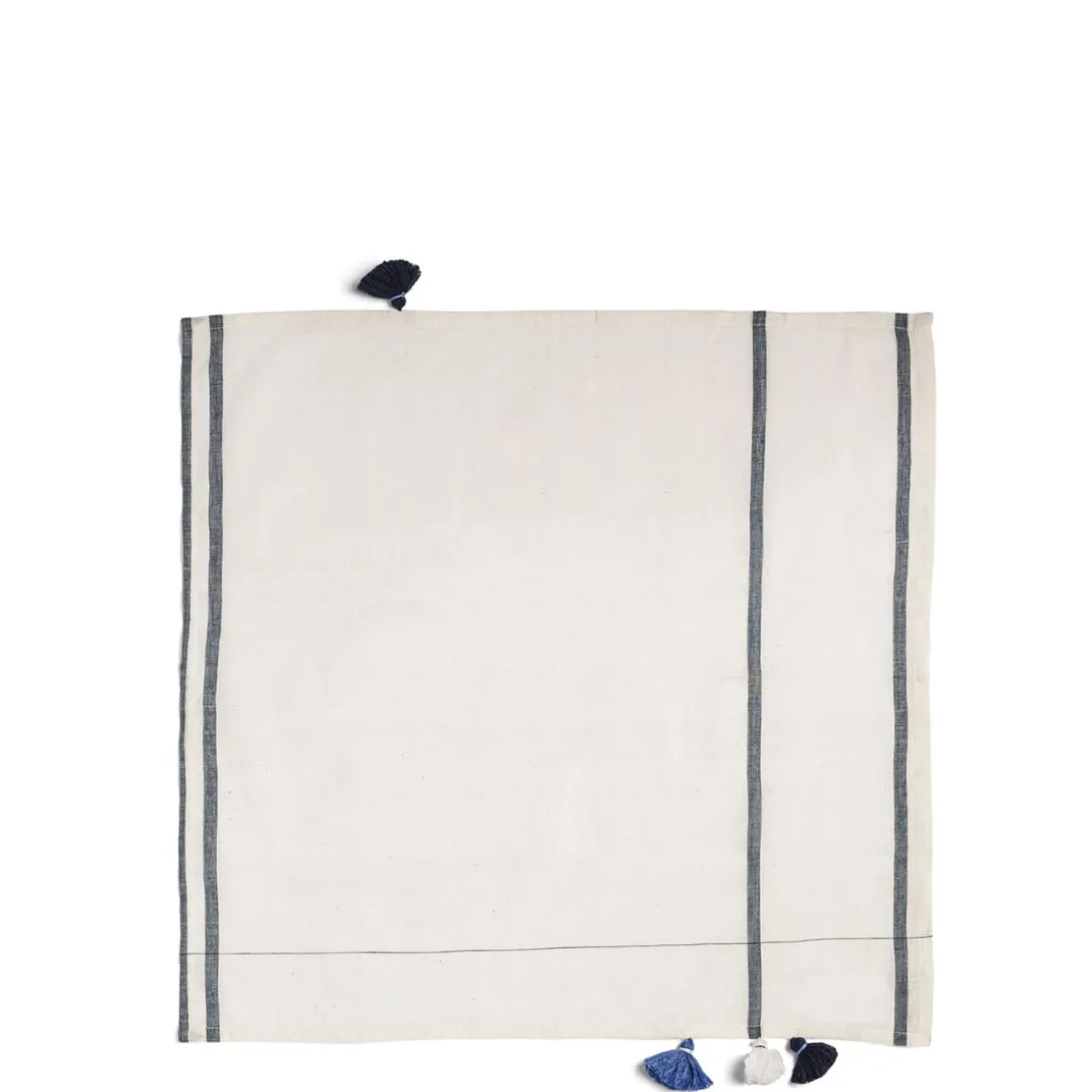 The clean, minimal lines on this handwoven cotton napkin evoke the crispness of a fresh, unwritten page in a notebook, while the fine embroidery and tassels add texture and playfulness.