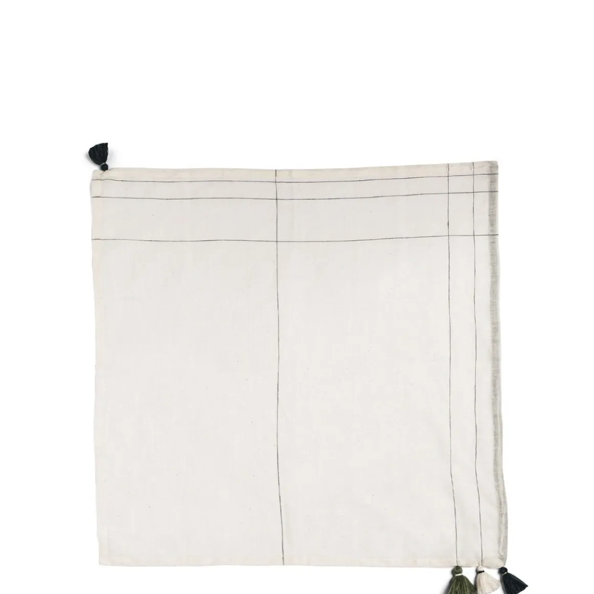 The clean, minimal lines on this handwoven cotton napkin evoke the crispness of a fresh, unwritten page in a notebook, while the fine embroidery and tassels add texture and playfulness.