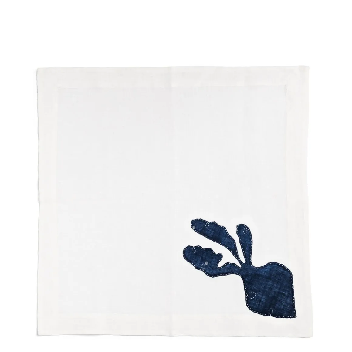 The eclectic vegetable motif is inspired by the bustling bazaars of India, dyed with natural indigo and sewn on using zero-waste appliqué.
